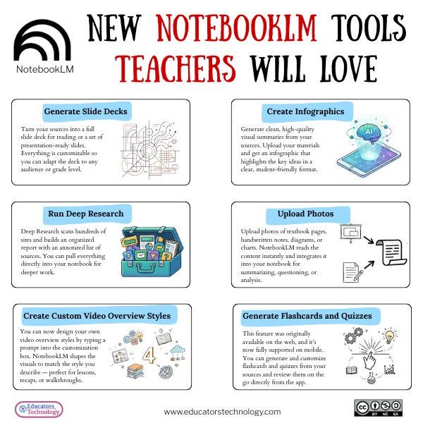 NotebookLM has introduced several updates that feel incredibly useful for teachers and librarians. Educators Technology pulled the information together, and I created this visual to highlight the features that stand out the most for our work. The one thing that really excites me about NotebookLM is the ability to tailor the data set. I have not found another AI tool that handles this in the same way. I can control exactly what information it draws from, which matters a great deal when working with students. The podcast feature has also been a game changer for learners who need different ways to connect with materials.